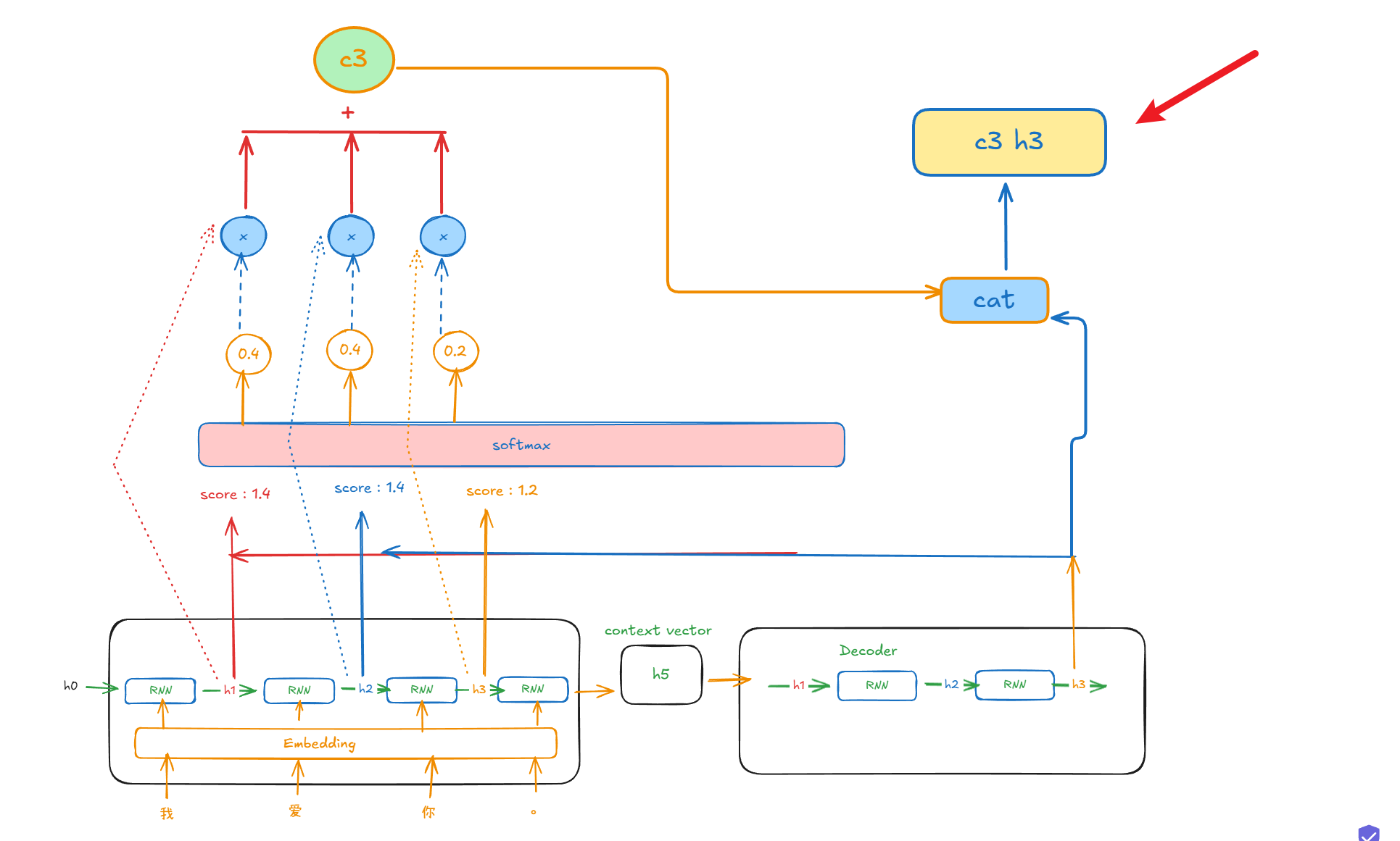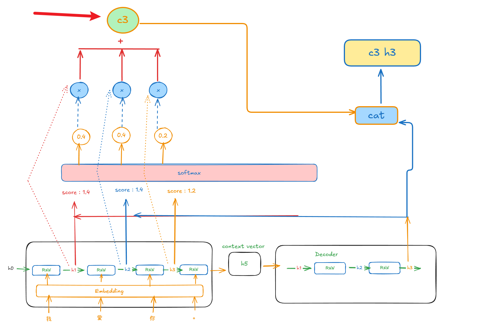 结果就是得到一个全新的、专属于当前时间步的——上下文向量。这个向量不再是整句信息的粗糙压缩,而是当前最需要信息的精华萃取,是动态生成的、量身定制的参考依据。