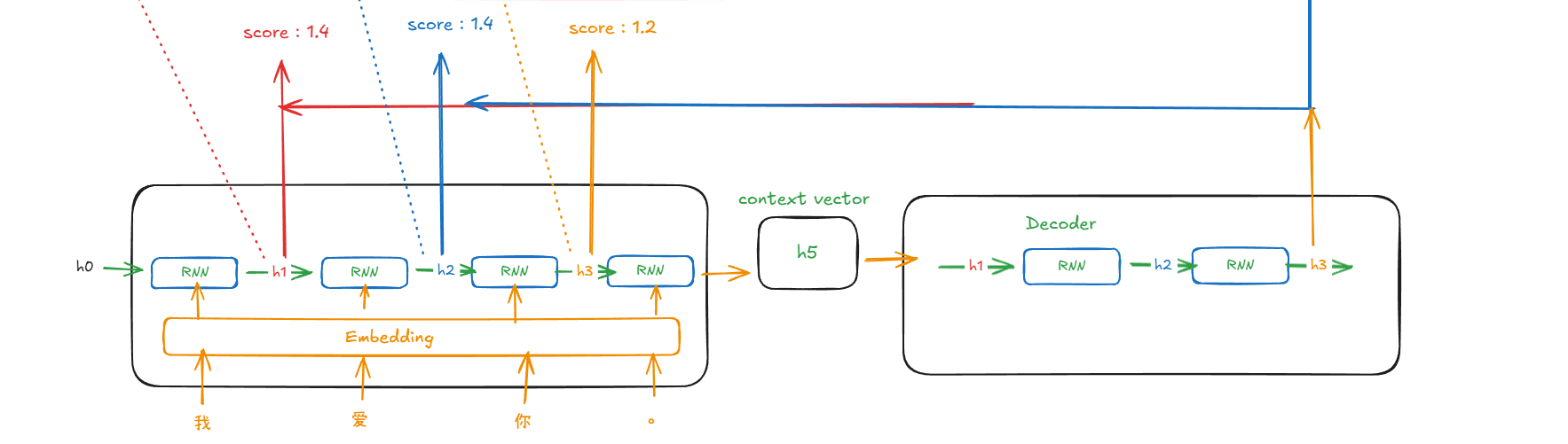 点积评分采用最直接的思路:计算解码器状态与编码器状态的点积作为相关性分数。其原理基于向量空间相似性——方向越接近,点积值越大,相关性则越强。