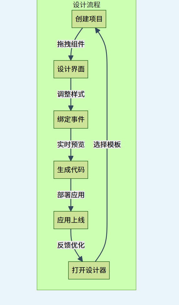 Ooder RAD 可视化设计器 v0.6.5 的核心链路遵循从设计到生成的流程,从用户的可视化设计开始,经过组件分析、模板选择、代码生成等步骤,最终生成可部署的应用代码。