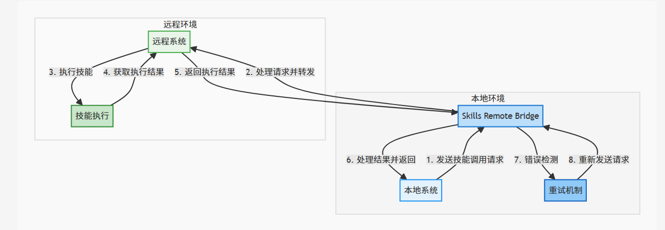 Skills Remote Bridge 的实现基于标准的网络协议和序列化机制,支持多种远程调用方式,如 HTTP、RPC 等。
