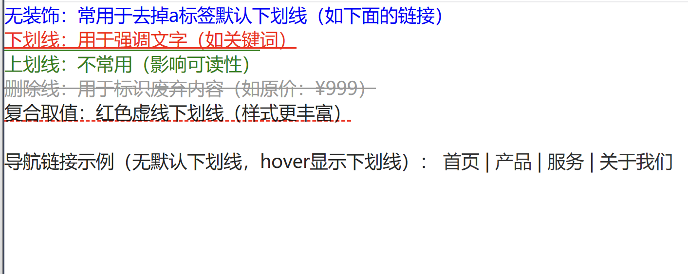 .decor-none { text-decoration: none; color: blue; } /* 无装饰 */