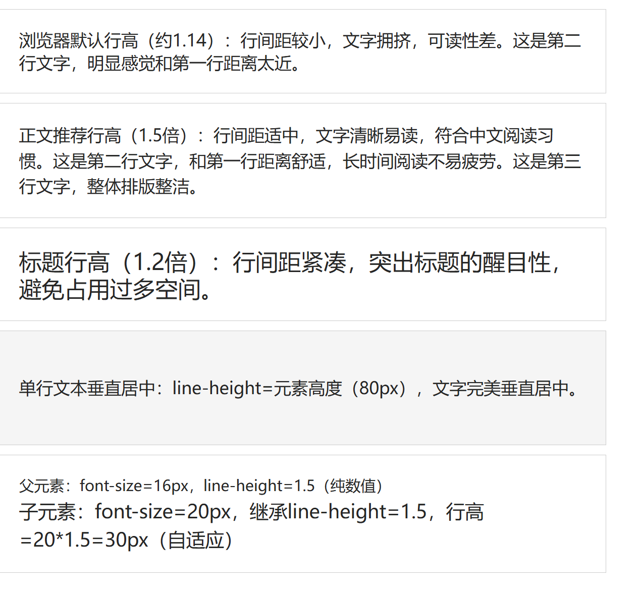 </html> 运行效果:line-height: 1.5 是正文最佳行高,line-height: 1.2 适合标题,line-height=元素高度 实现单行文本垂直居中,纯数值继承让子元素行高自适应。