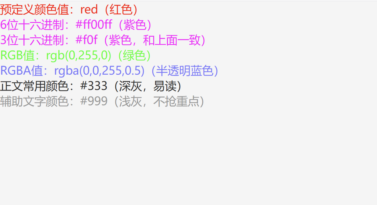 color | 设置文本颜色 | 预定义值、十六进制、RGB/RGBA | 正文用 #333,辅助文字用 #999,RGBA 支持透明度 |
