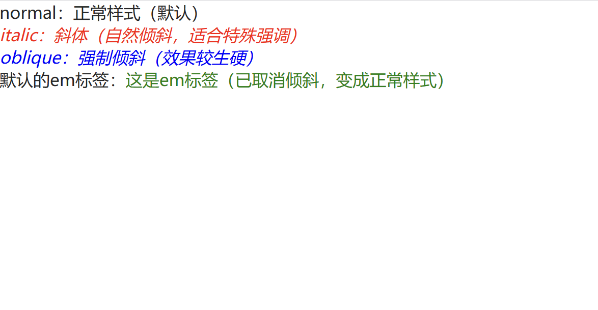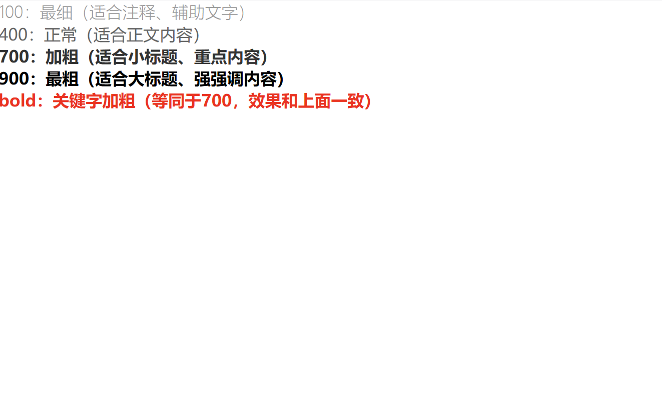normal = 400(默认值);bold = 700(最常用的加粗值);400 和 700,设置 300 或 900 可能无效果。700 代替 bold),兼容性更好;避免使用 bolder 和 lighter(依赖父元素粗细,效果不可控)。