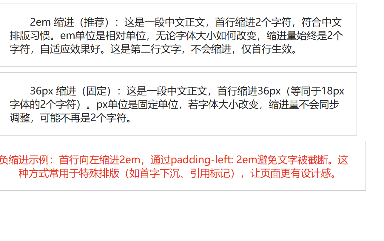 </html> 运行效果:indent-em 首行缩进 2 个字符(中文排版标准),indent-px 缩进量固定,indent-negative 实现负缩进特殊效果。