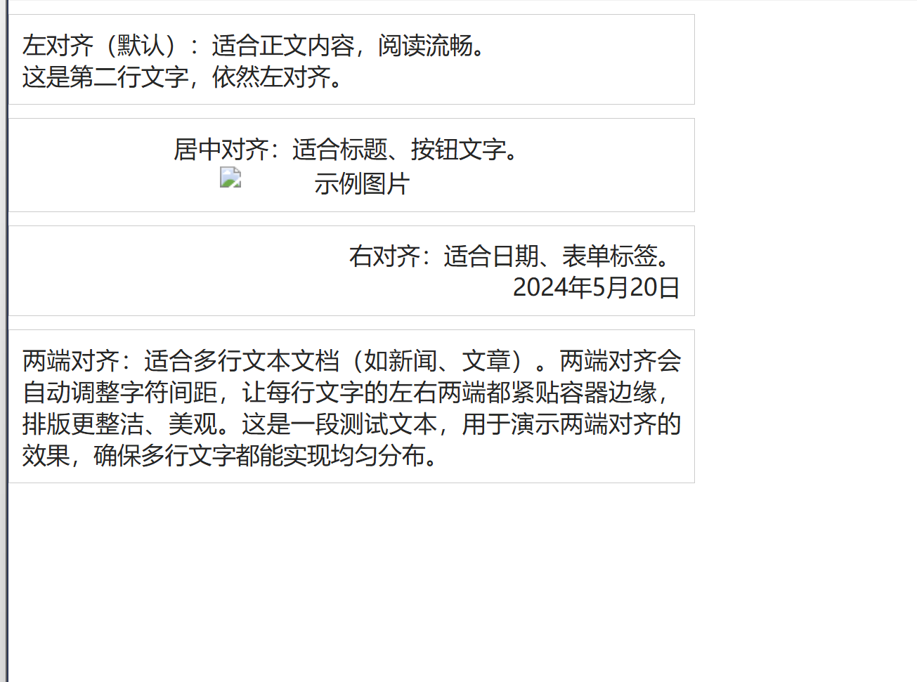 </html>运行效果:左对齐适合正文,居中对齐让标题和图片居中,右对齐适合日期,两端对齐让多行文本排版更整洁。