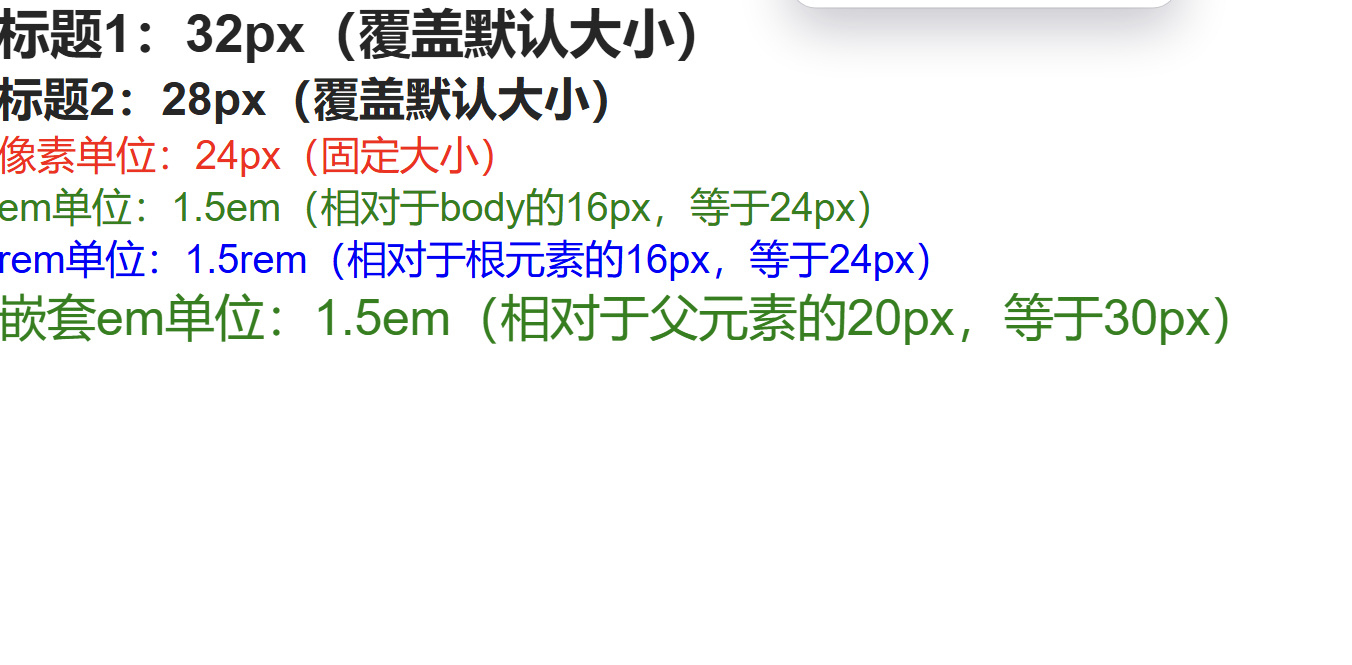 font-size: 16px,子元素 font-size: 1.5em,则子元素文字大小为 16px * 1.5 = 24px;<html>)的字体大小(1rem = <html> 的 font-size 值)。
