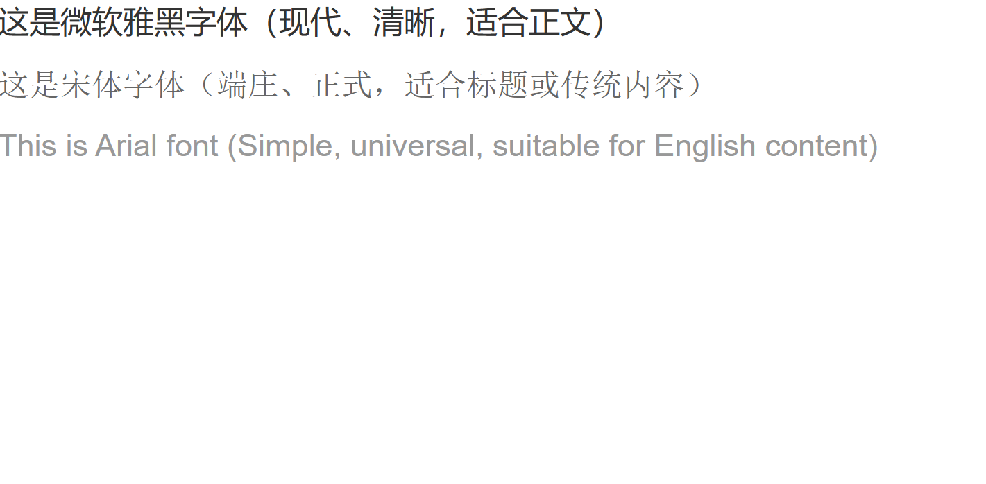 </html>运行效果:三个 div 分别显示微软雅黑、宋体、Arial 字体,即使某类字体未安装,也会被备选字体替换,保证样式不错乱。