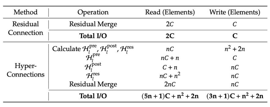 所以 FlopsmHC≈ 2ndmodel (n2+3n+3)bs+2(n2+ 2n)+Iter×n2,其中n通常为4,Iter为20,相比dmodel,n与Iter都不算大。传统残差的计算量是dmodelbs次加法。