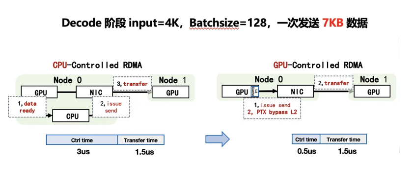 七、通信优化 | MoE架构通信是性能关键瓶颈 | 1. DeepEP定制通信库2. TRMT优化(Bypass CPU/L2、负载均衡)3. NIXL零拷贝传输 | 通信算子耗时降低60%、控制面时延从3us降至0.5us |