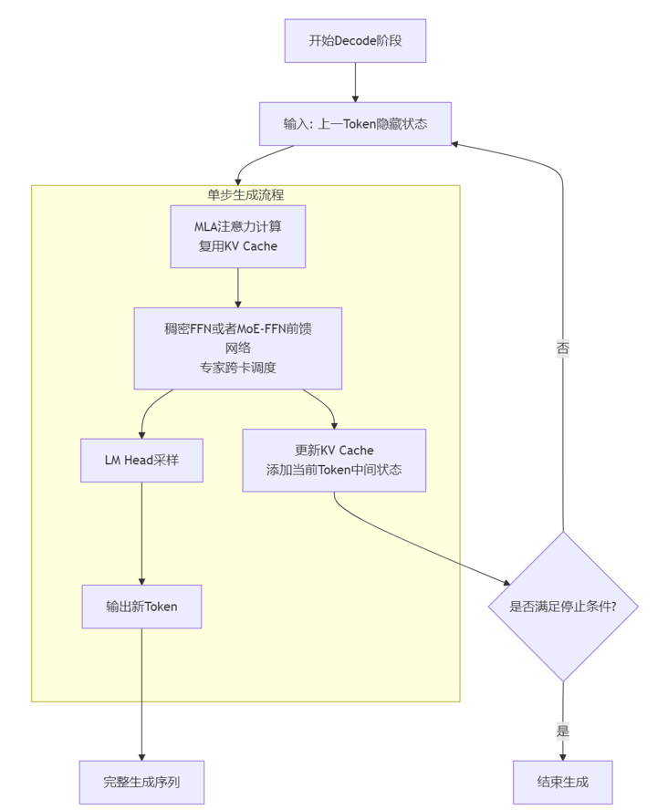 上一 Token 隐藏状态→ MLA(复用 KV Cache)→MoE-FFN→LM Head 采样→更新 KV Cache→重复至停止条件。
