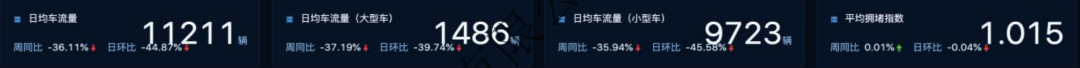 展示当日数据:包括日均车流量、周同比、日环比;大型车的日均车流量、周同比、 日环比;小型车的日均车流量、周同比、日环比;平均拥堵指数。