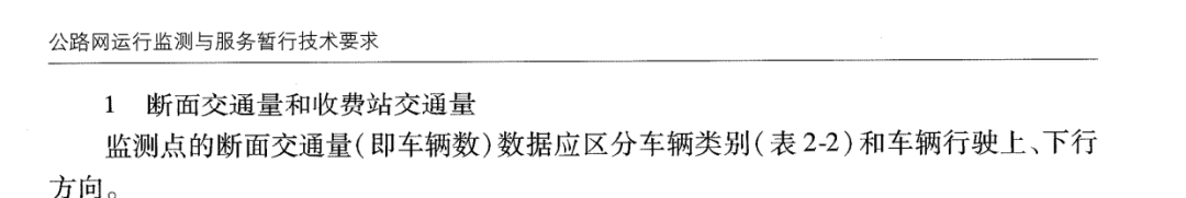 根据前端采集设备的不同,统计车辆类型有所区别,在《公路网运行监测与服务暂行技术要求》中,确定了采用车辆数统计。
