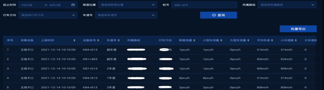 信息列表:查询出的断面流量信息包括流量采集设备名称、上报时 间、设备桩号、车道号、所属路段、行车方向、断面流量、小型车流量、大型车流量、平 均车速、小车速度、大车速度。