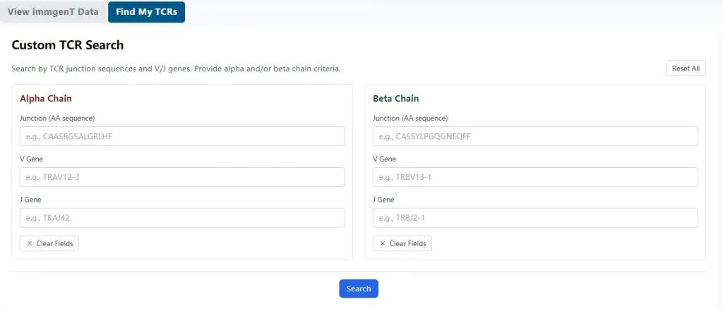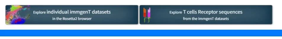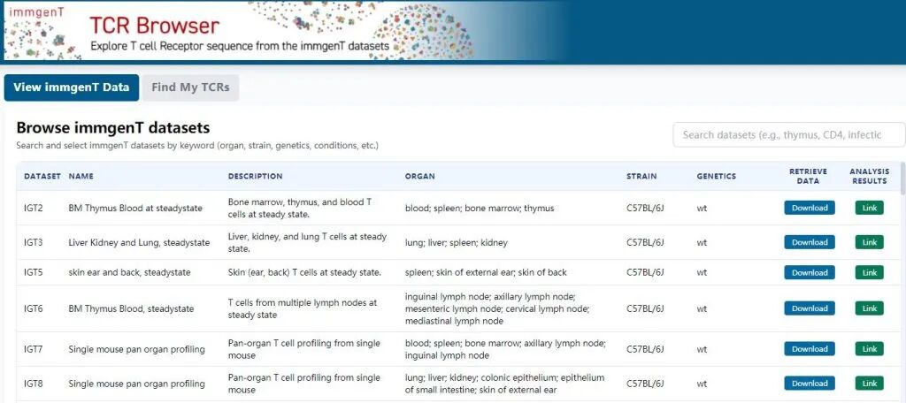 在Immgene T 模块下,explore T cells Receptor sequences页面进行不同转录组数据集中TCR序列相关信息的分析。其中View immgeneT Data是查看数据集,Find my TCRs是查询感兴趣的TCRa,TCRb基因与ImmgenT数据集哪些样本中存在重叠序列。