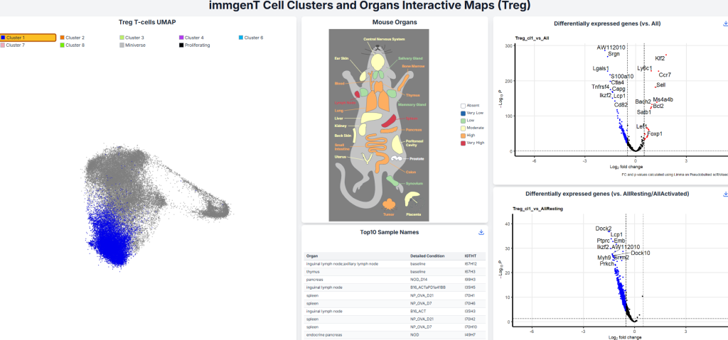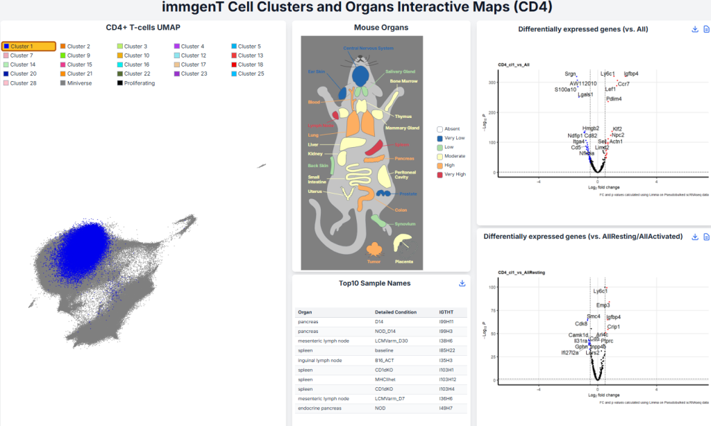 该网页通过交互式地图与统计图表,直观揭示了CD4+ T细胞亚群在不同生理病理状态下的转录组特征,特别是Cluster 1表现出的激活或效应记忆样表型(如Ly6c1高表达、Ccr7低表达),为免疫学研究提供了重要的数据参考。