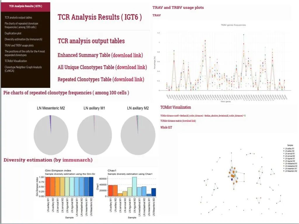 其中点击单个数据集,跳转到TCR 分析结果页面,分析了单细胞转录组中,TCR克隆分布特定,TRAV,TRBV使用频率,TCR多样性以及TCR克隆的相似性。