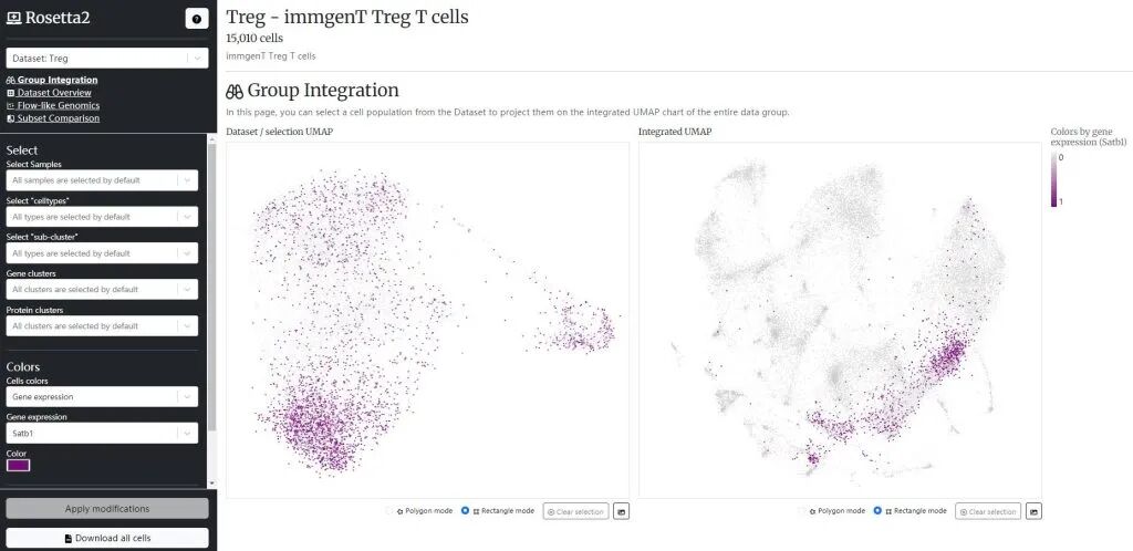 2. 分析特定数据集的单细胞基因表达分布: 如下图所示,通过交互式 UMAP 图表探索特定基因(如 Satb1)在调节性 T 细胞数据集中的表达分布。页面提供了细胞类型筛选、亚群选择及绘图模式切换工具。在Colors模块选择Gene expression , Gene expression 下输入目的基因。