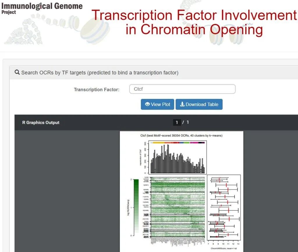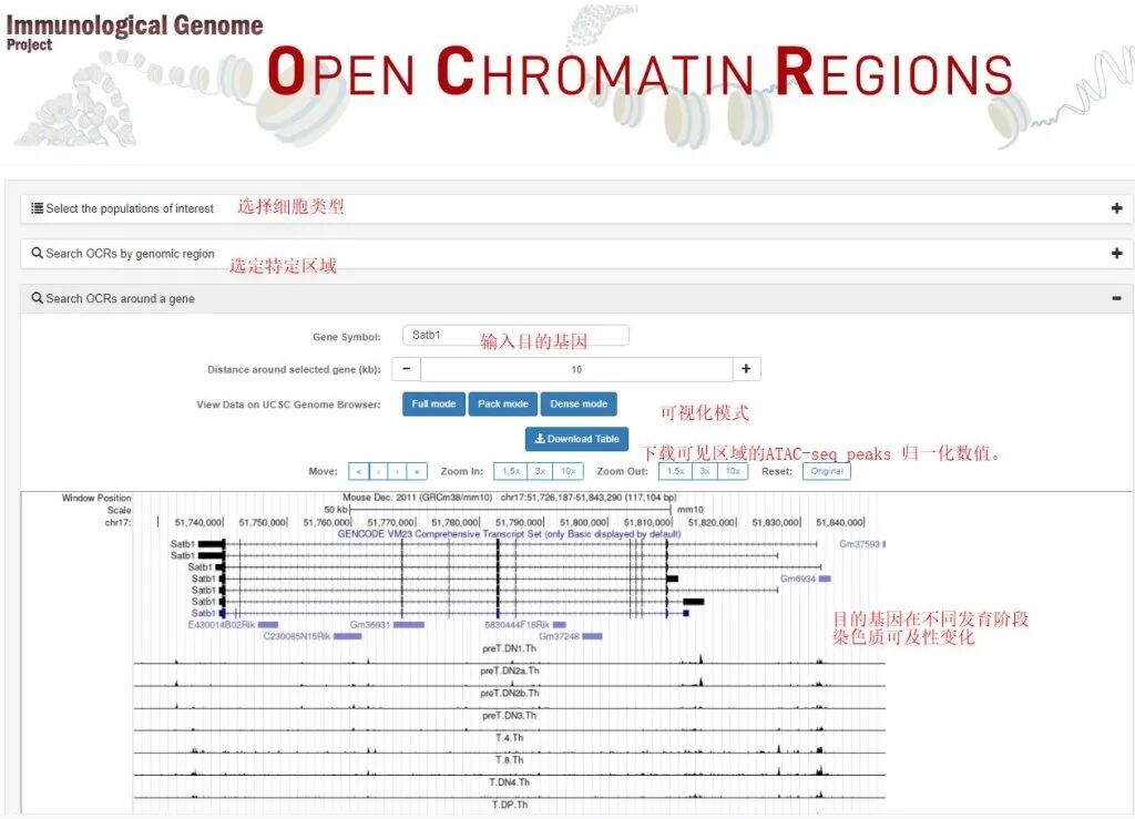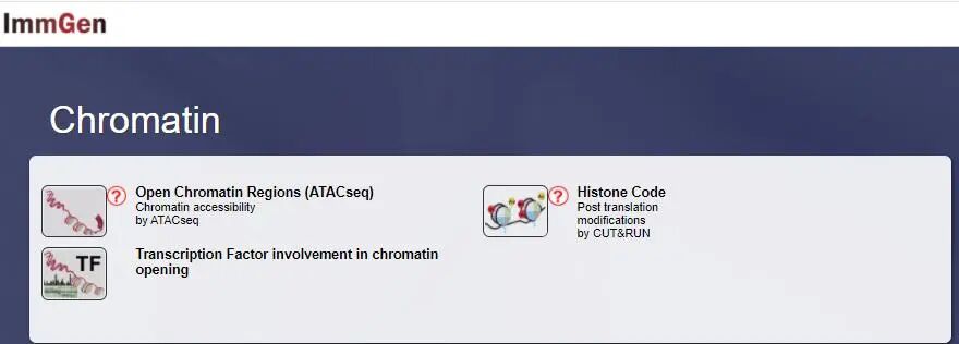 在ImmGen 的Chromatin模块,不同组织不同免疫细胞发育阶段或刺激后的开放染色质区域ATAC-seq数据、组蛋白修饰CUT&RUN以及转录因子分析。