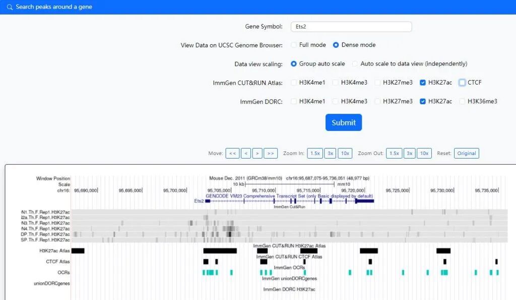 2.分析组蛋白修饰:在这个界面我们可以选择不同细胞谱系、细胞亚群、染色质标记(主要是组蛋白修饰与CTCF)、组织来源、质检或者实验室来源来筛选样本。如下所示,我们依然选择胸腺来源的T细胞亚群。输入目的基因位点,就可以查看这个基因位点在胸腺细胞不同发育阶段(不同细胞亚群中)中的H3K27ac修饰区域的差异。