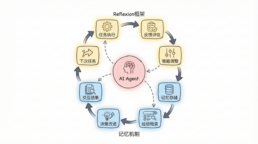 反馈:AI完成任务后会评估自己的推理过程。比如Reflexion框架让AI检查自己的行动序列是否有效。发现问题后,它会在下次任务中避免同样的错误。
