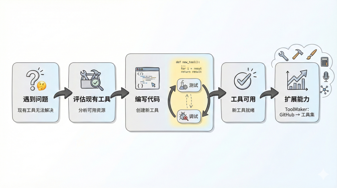 当遇到现有工具无法解决的问题时,AI会写代码、测试、调试,直到创建出能用的工具。比如ToolMaker框架甚至可以把整个GitHub仓库转换成AI可调用的工具集。