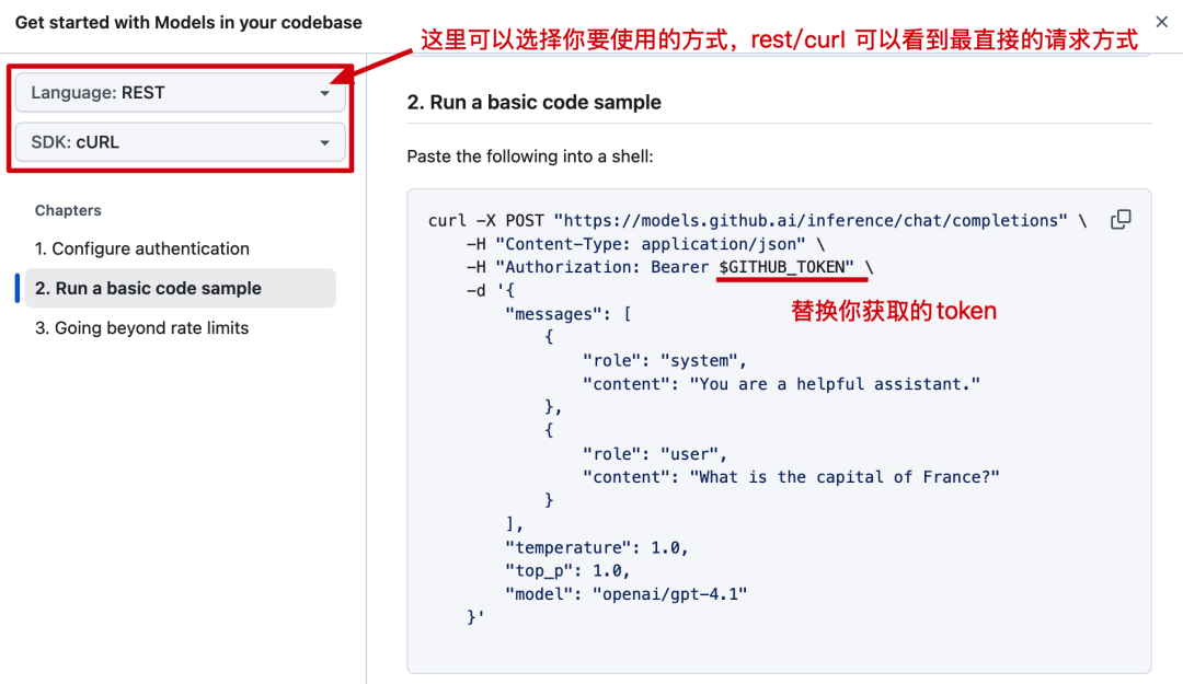 • 这是一段基于 Spring AI 配置 github llm api的使用方式,尤其注意,baseUrl、apiKey、completionsPath、embeddingsPath、openai/gpt-4.1,这些配置信息和你直接使用管的 gpt 配置是有差异的。