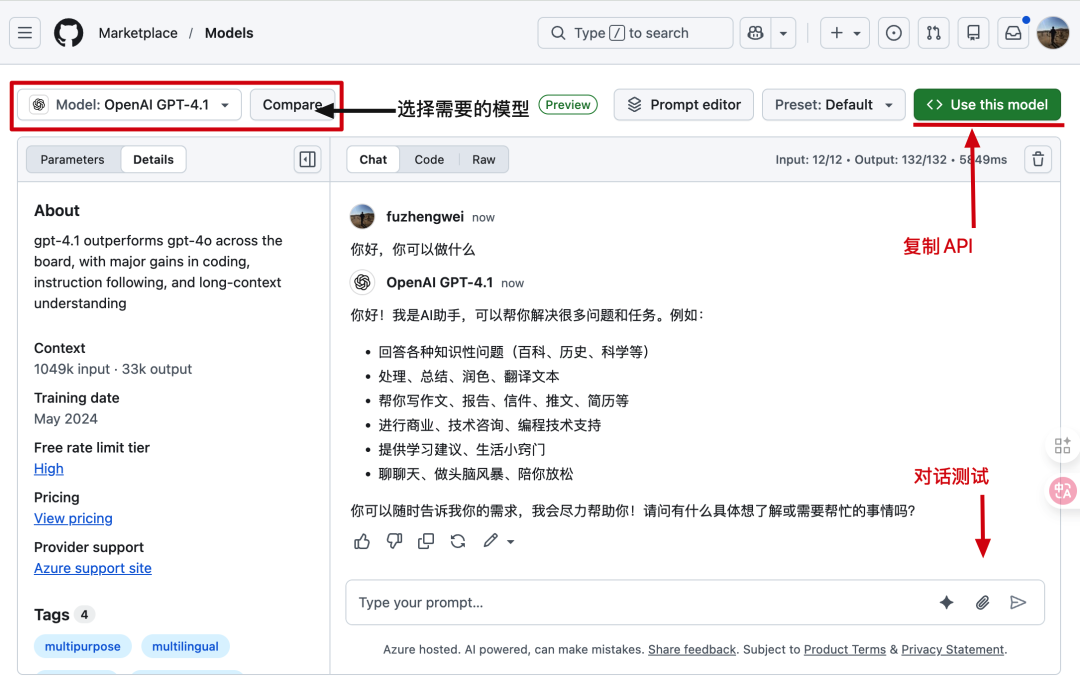 地址:https://github.com/marketplace/models/azure-openai/gpt-4-1/playground