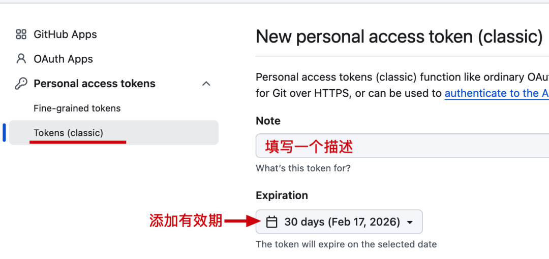 • 在 Tokens 下,添加 Note 描述和过期时间,完事后不用加任何其他权限,拉到最后设置点击 Generate token 生成令牌即可。