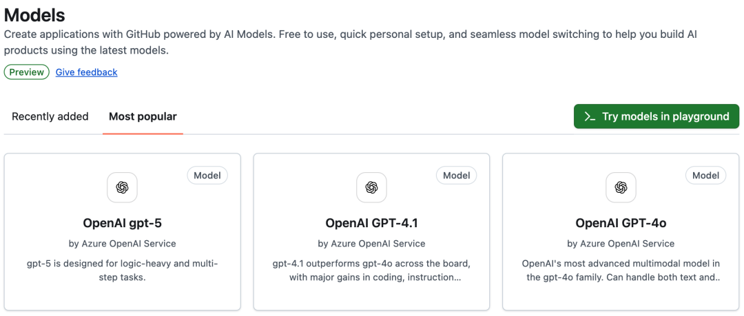 在 Github marketplace 下提供了非常多的免费的 LLM 使用,gpt-5、gpt-4.1 都是有的,具备完整的测试功能。有时候还会新增加其他模型。