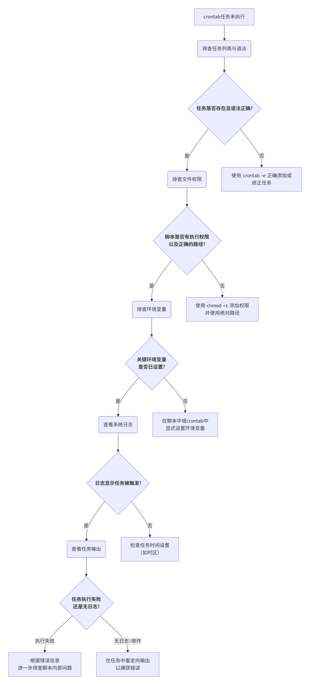 # 如果任务因此能执行,需调整安全策略而非永久禁用SELinux总结:Crontab任务排查清单