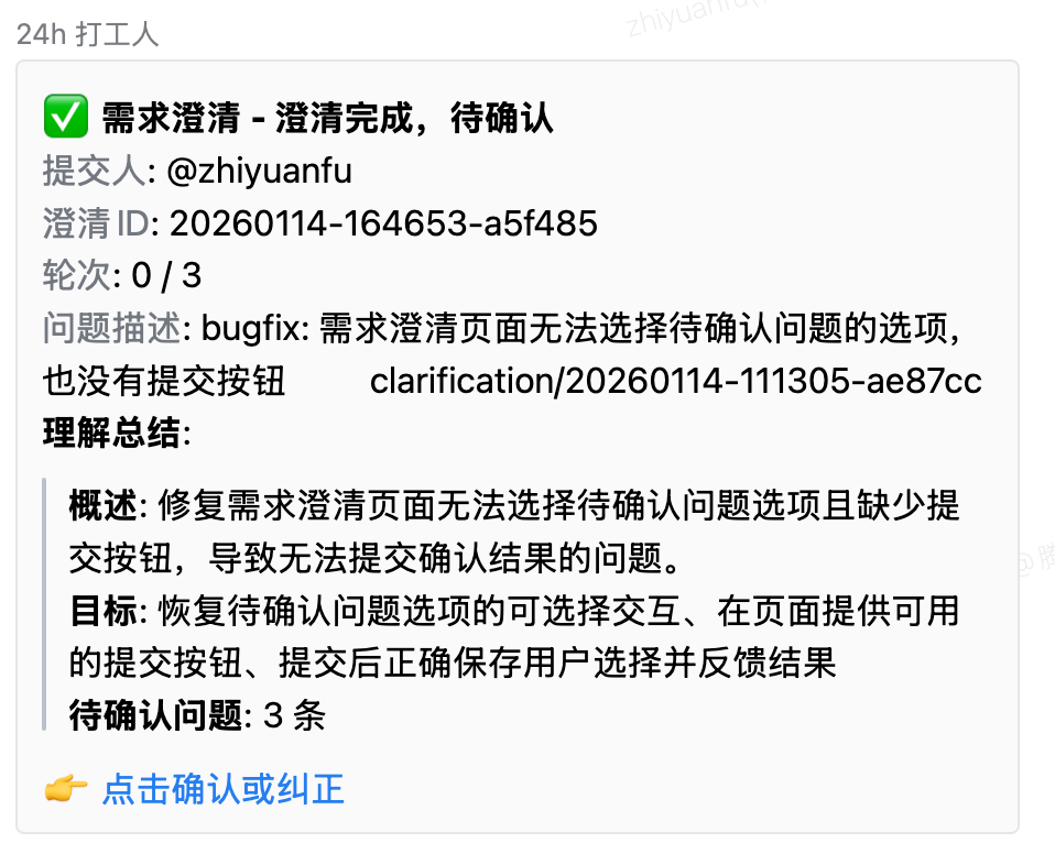 整个过程我只做了两件事:提交反馈、确认澄清。剩下的,24h 打工人自己搞定了。
