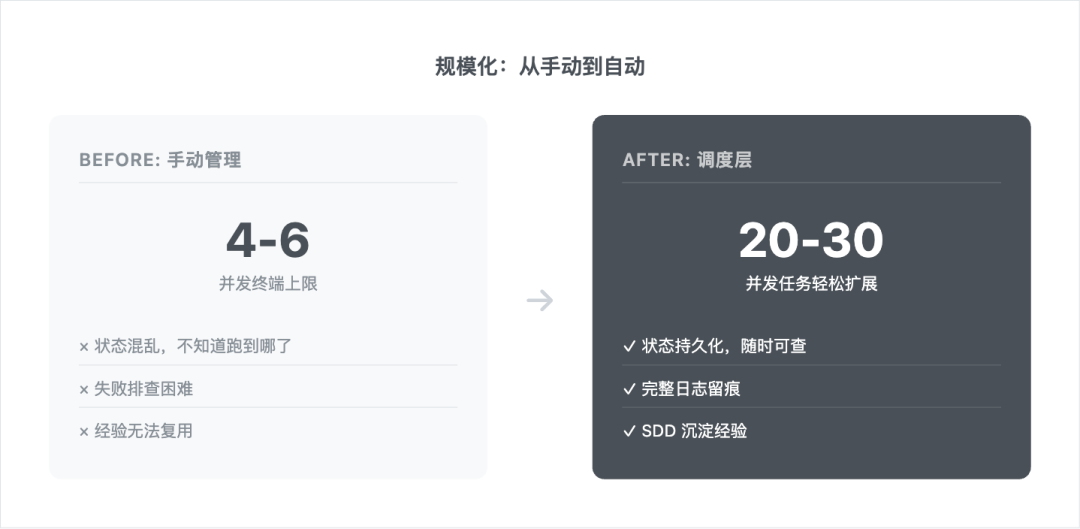 一个人同时开 4-6 个终端,就是极限了。但有了调度层,可以轻松扩展到 20-30 个并发任务。