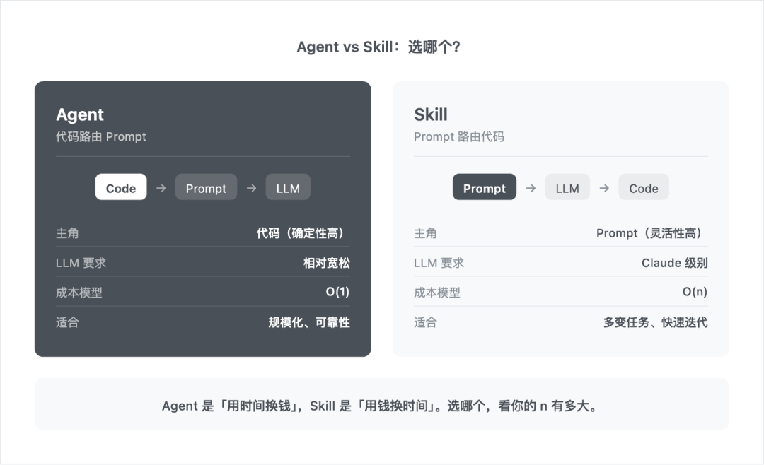 Agent 是「用时间换钱」,Skill 是「用钱换时间」。选哪个,看你的 n 有多大。