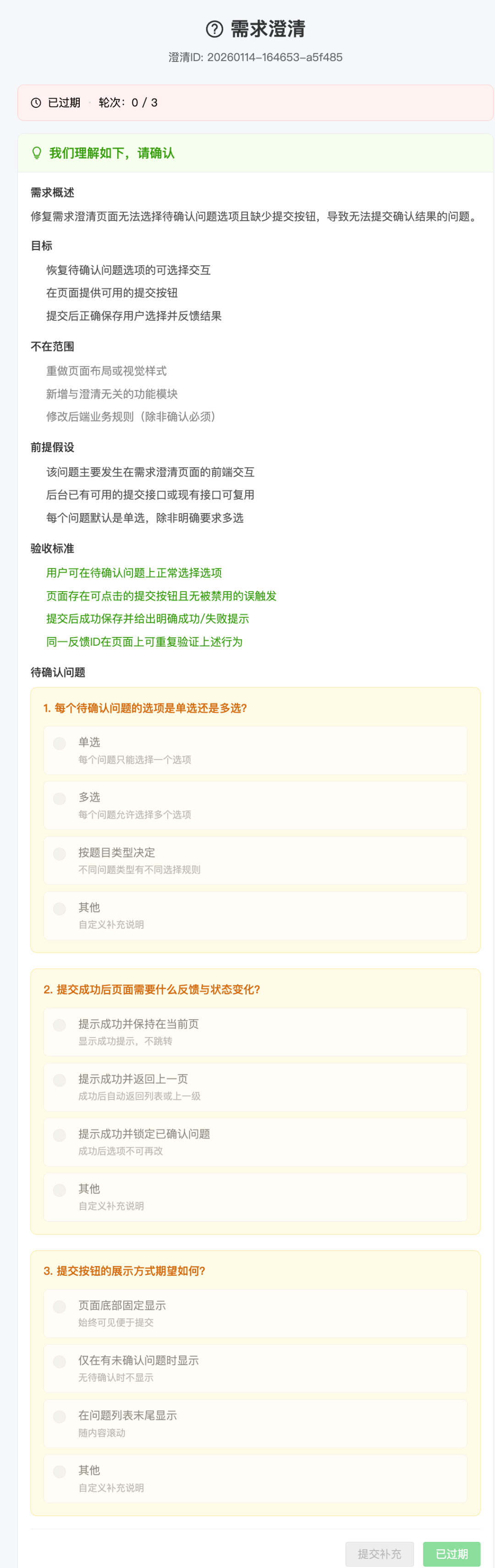 有一天我发现需求澄清页面有 bug——「无法选择待确认问题的选项,也没有提交按钮」。