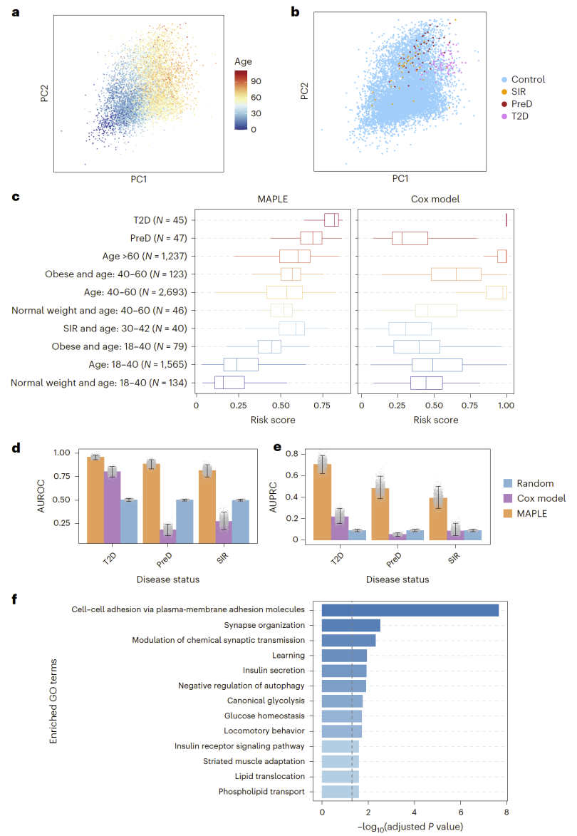 MAPLE 同样在 2 型糖尿病风险评估中表现出较高的准确性,能够区分正常人群、胰岛素抵抗、糖尿病前期和确诊患者。模型识别出的相关 CpG 位点与葡萄糖代谢、胰岛素信号通路和能量稳态密切相关。