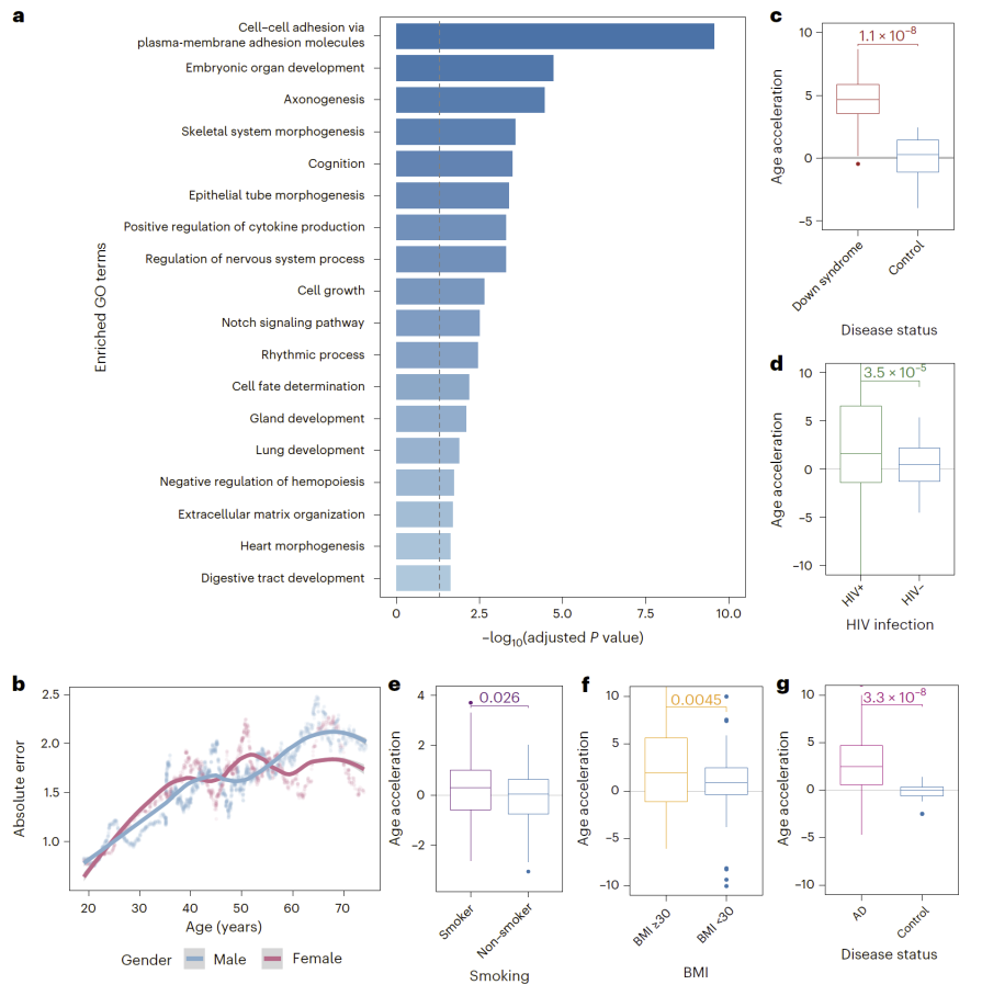 通过对模型中关键信息位点的分析,MAPLE 识别出与衰老密切相关的 CpG 位点,这些位点富集于发育、细胞黏附、认知和免疫调控等生物过程。此外,MAPLE 成功捕捉到性别相关的衰老轨迹差异,并在唐氏综合征、HIV 感染、吸烟、肥胖和阿尔茨海默病等人群中检测到显著的加速衰老信号。