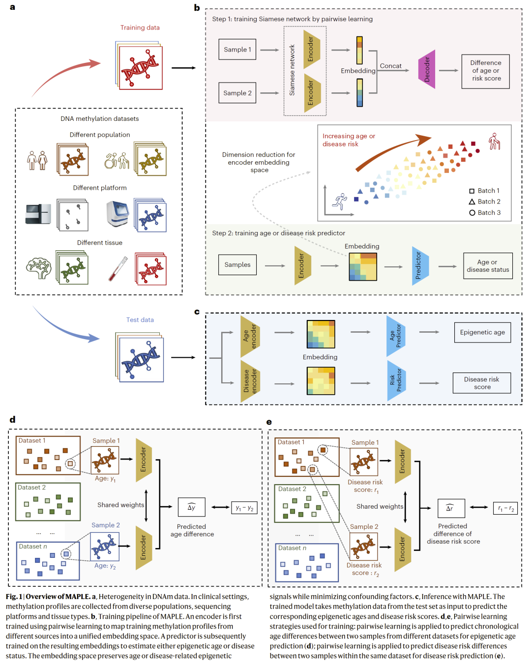 DNA 甲基化被广泛用于评估生物学年龄和疾病风险,但现有表观遗传时钟在跨平台、跨组织和跨队列应用时易受批次效应影响,限制了其临床可用性。研究人员提出了一种基于成对学习的稳健计算框架 MAPLE,用于甲基化年龄和疾病风险预测。该方法通过学习样本之间的相对关系而非绝对数值,有效提取与衰老和疾病相关的生物信号,同时显著降低技术偏差的影响。在多个独立数据集和任务中,MAPLE 在甲基化年龄预测以及心血管疾病和 2 型糖尿病风险评估方面均表现出优异的准确性和泛化能力,显示出良好的临床应用潜力。