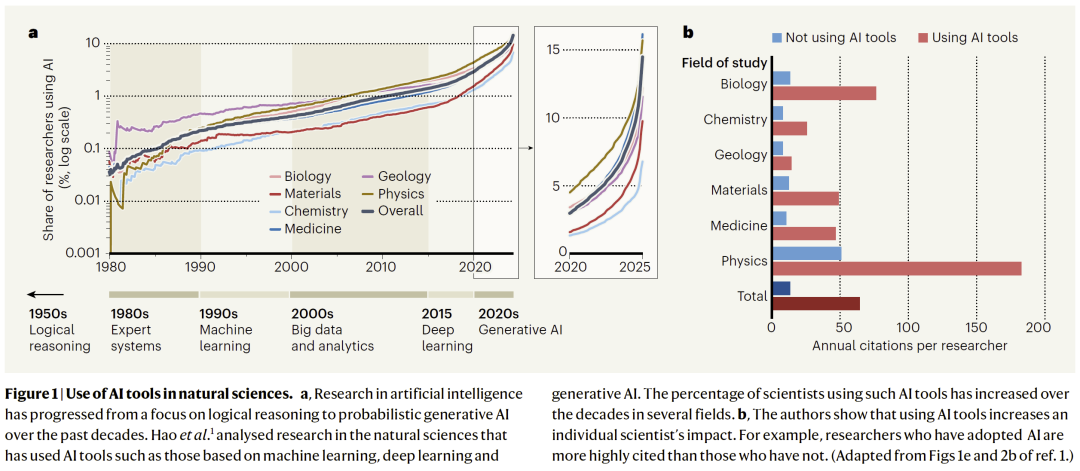 他们分析了1980年至2025年间自然科学领域使用AI技术的研究论文,并将AI发展分为三个阶段:机器学习时代、深度学习时代以及生成式AI时代。