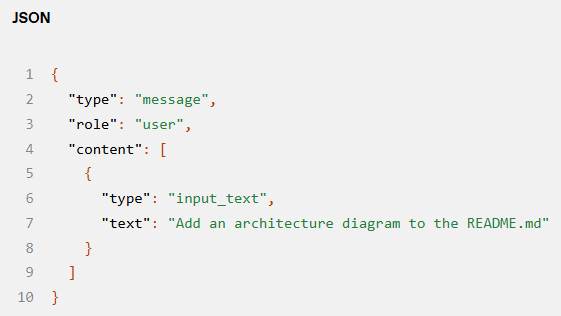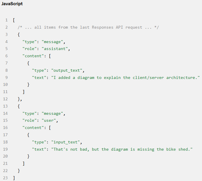 之前的例子集中在每条消息的内容上,但请注意,input 的每个元素都是一个具有 type、role 和 content 的 JSON 对象,如下所示: