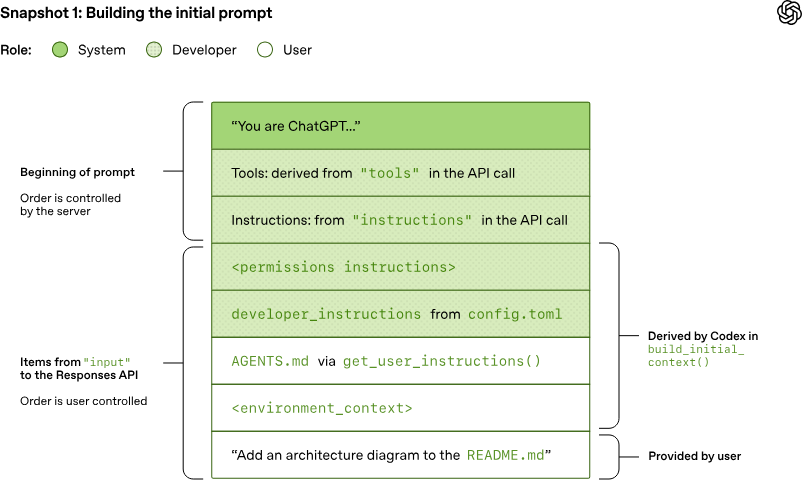 接下来,让我们探索 Codex 如何为对话中的第一次推理调用创建提示词。