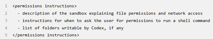 1. 一条 role=developer 的消息,描述仅适用于 tools 部分定义的 Codex 提供之 shell 工具的沙箱环境。也就是说,其他工具(如 MCP 服务器提供的工具)不受 Codex 沙箱限制,需自行负责执行安全准则。该消息是根据模板构建的,其中关键内容来自捆绑在 Codex CLI 中的 Markdown 片段,如 workspace_write.md 和 on_request.md: