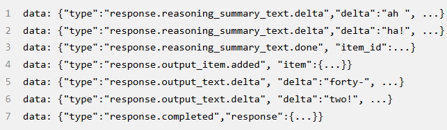 对 Responses API 的这个 HTTP 请求启动了 Codex 对话的第一个「轮次」。服务器以服务器发送事件(SSE)流的形式进行回复。每个事件的数据都是一个 JSON 负载,其 type 以 response 开头,可能类似于这样(事件的完整列表可以在 OpenAI 的 API 文档中找到):