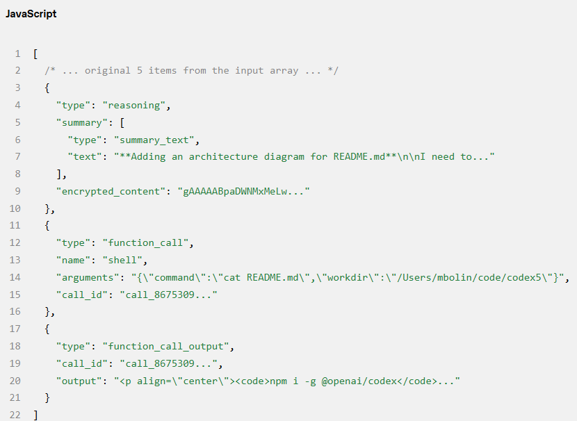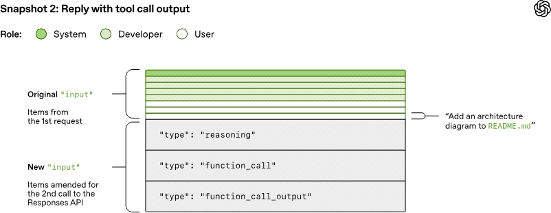 假设对 Responses API 的第一个请求包含了两个 response.output_item.done 事件:一个类型为 reasoning(推理),一个类型为 function_call(函数调用)。当 OpenAI 再次使用工具调用的结果查询模型时,这些事件必须体现在 JSON 的 input 字段中: