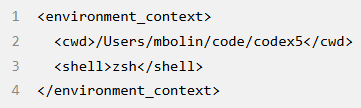 4. 一条 role=user 的消息,描述智能体当前运行的本地环境。这指定了当前工作目录和用户的 Shell: