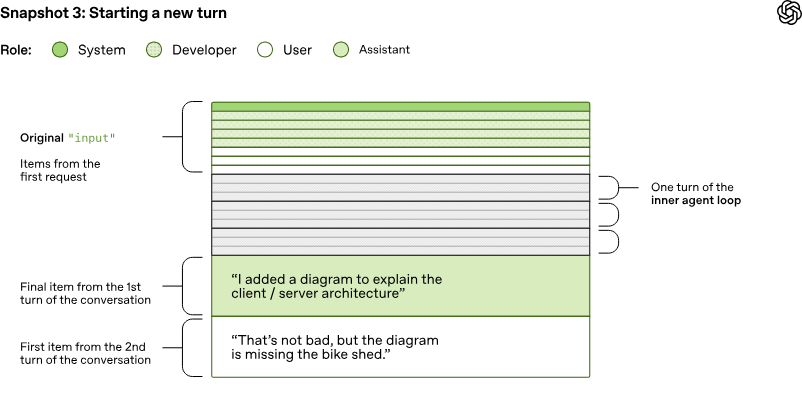 再一次,由于 OpenAI 正在继续对话,OpenAI 发送给 Responses API 的输入长度会不断增加: