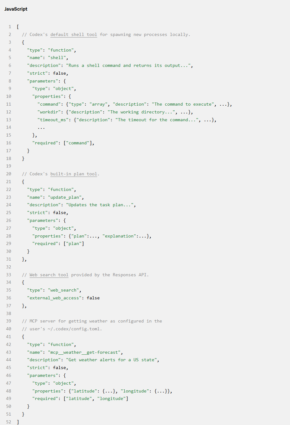 tools 字段是符合 Responses API 架构的工具定义列表。对于 Codex,这包括 CLI 提供的工具、API 提供的工具以及用户通过 MCP(模型上下文协议) 服务器提供的工具。