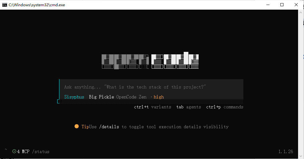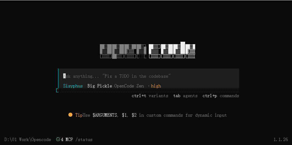 首先,我们根据官网链接进行安装后,直接运行cmd,进入后输入opencode,也可以在对应的文件夹里打开cmd命令窗口: