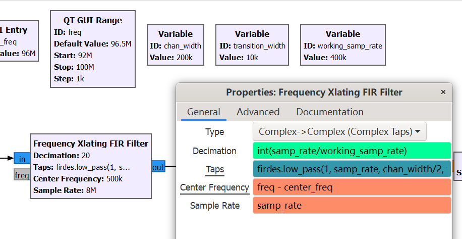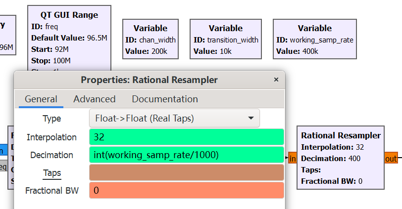 接下来可以对流程图进行一些优化,比如现在采样率是 400k 如果想要改成其他值需要调整多个模块,我们可以创建一个变量 working_samp_rate,把值设置为 400e3,然后把 Decimation 属性改为 int(samp_rate/working_samp_rate) 这样就会根据原始的采样率和模块输出端所需的采样率来计算 Decimation,由于 Decimation 必须是整数值,因此使用 python 的 int 变量来强制转换类型为整数
