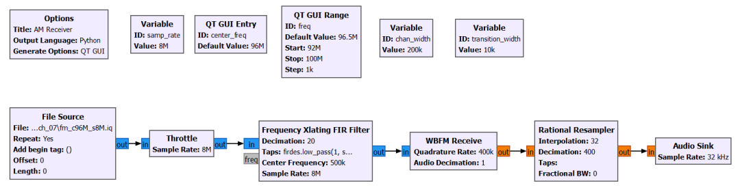 将原来的 AM Demod 替换成 WBFM Receive,设置 Quadrature Rate 为 400k,将“Audio Decimation”(音频抽取率)设置为 1,修改完后流程图如下,启动后可以调整 freq 变量,在多个频率上听到广播声音(96.5M、97.3M 等)